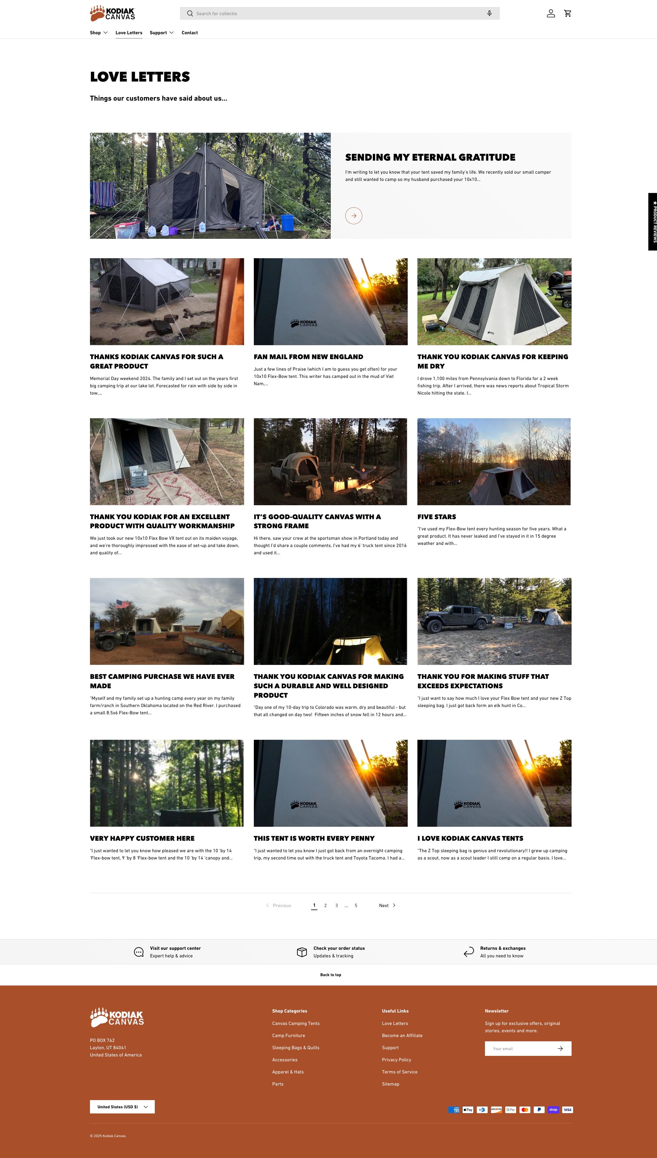 To ease these doubts, Kodiak Canvas created its “Love Letters” section, a dedicated space where satisfied customers share photos and stories highlighting their actual camping experiences. Rather than listing bullet points about fabric strength or weatherproof features, this page allows campers to see tents set up beside crackling campfires or perched in rugged landscapes. Each testimonial offers an authentic, relatable snapshot of how Kodiak Canvas products perform in real-life scenarios, ensuring that potential buyers recognize the brand’s reliability beyond just marketing claims.