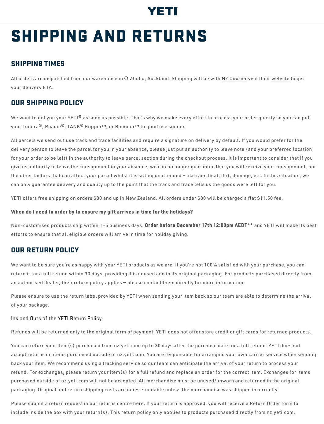 YETI addresses these concerns head-on by detailing every aspect of shipping and returns, from dispatch times out of their warehouse in Ōtāhuhu, Auckland, to requiring signatures for delivery and offering an authority-to-leave option. They also provide free shipping on orders over $80 and a flat fee for lower totals, giving customers a clear cost breakdown. Just as importantly, the return process is spelled out: YETI allows a 30-day window for refunds on unused products, and even guides buyers through the steps to send their purchase back, including the option to use a YETI-provided return label for tracking.