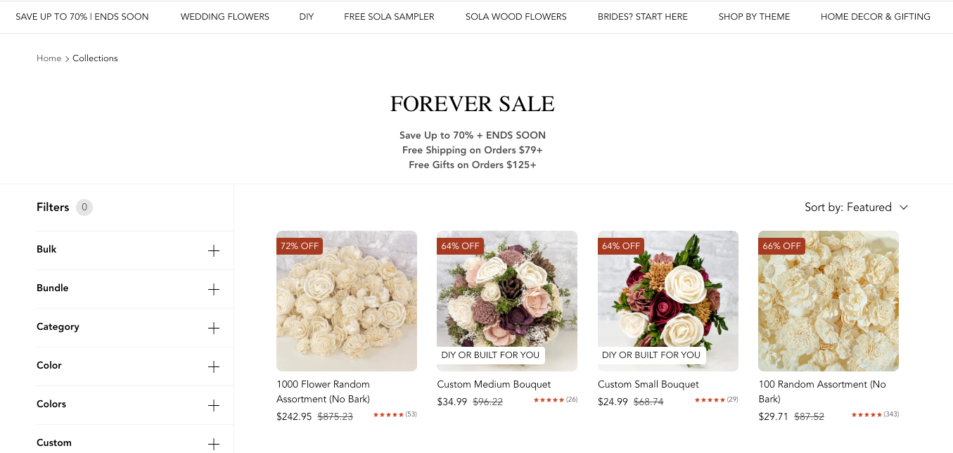 Sola Wood Flowers appears to tackle this by prominently showcasing large discount percentages and emphasising that deals end soon. Bold markers such as up to 70 percent off, free shipping above a set order value, and free gifts on qualifying purchases all reinforce a sense of urgency. These eye-catching details likely capture attention, prompting customers to finalise their purchases rather than leaving items unpurchased.